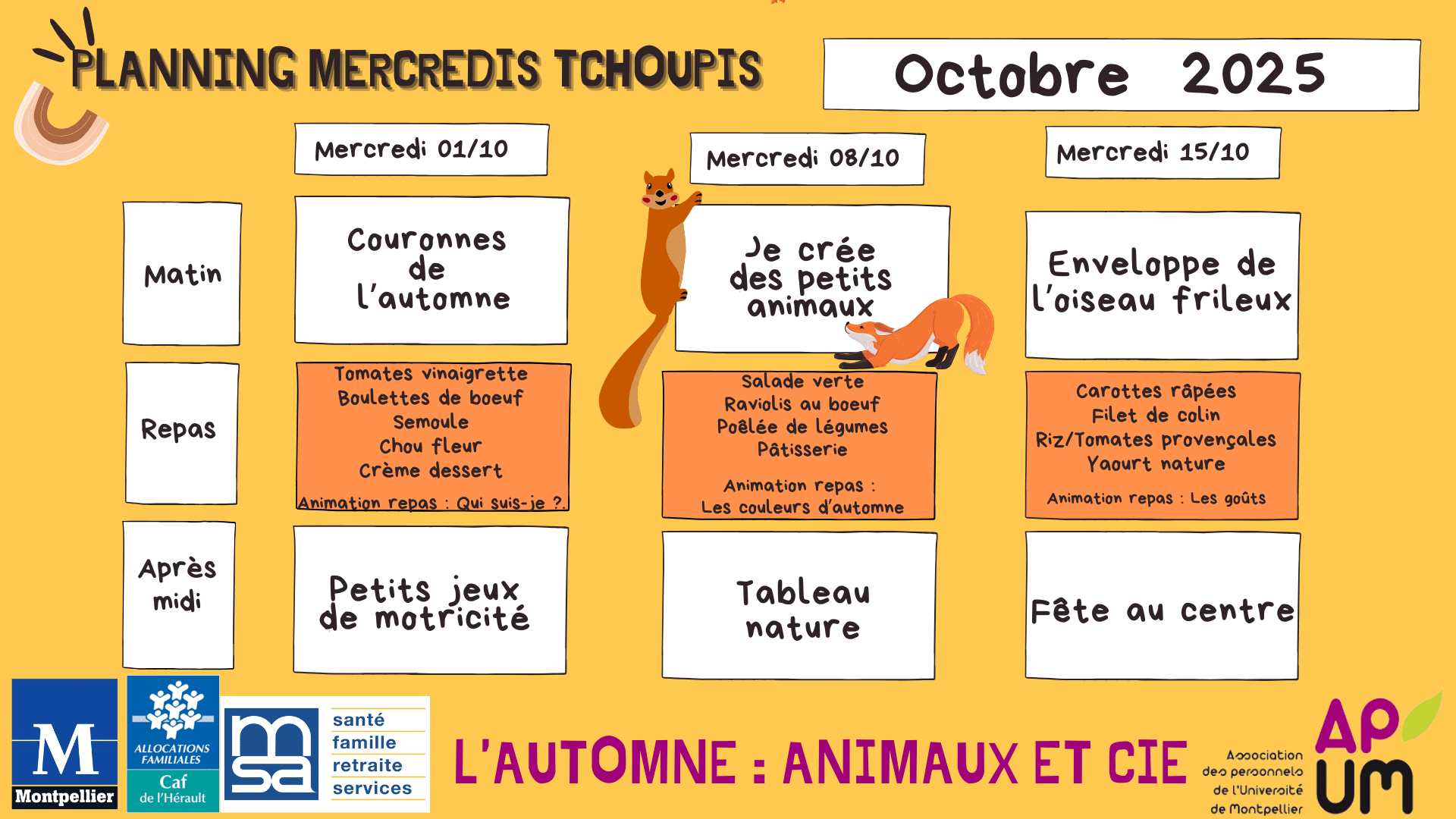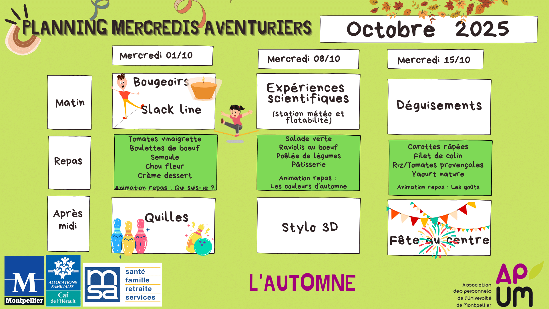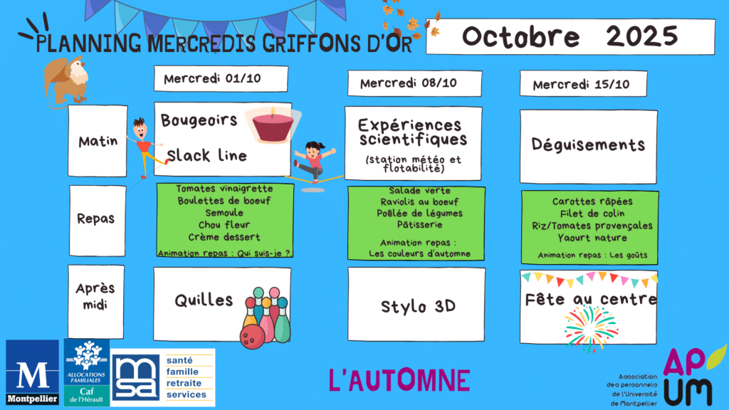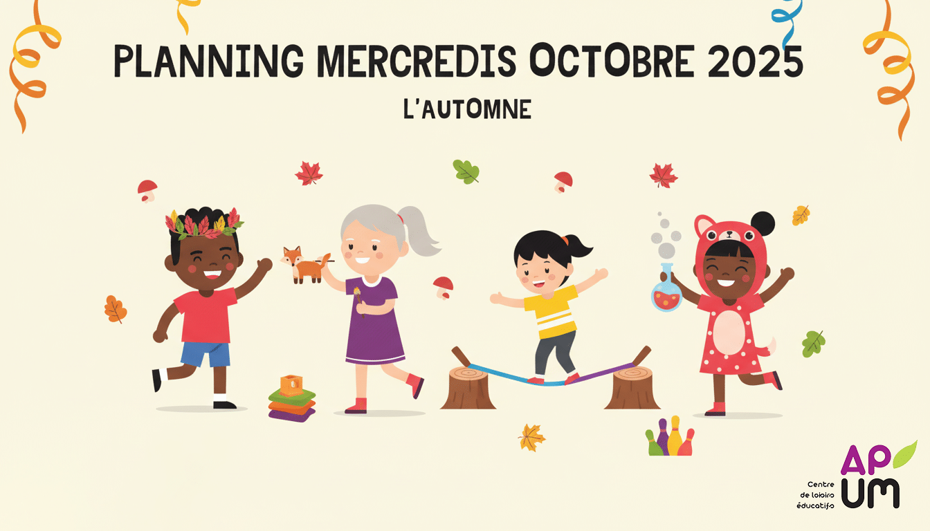 Le centre de loisirs de l’APUM se met aux couleurs de l’automne pour les trois premiers mercredis du mois d’octobre. Voici le détail des activités prévues pour chaque groupe les 1er, 8 et 15 octobre 2025.