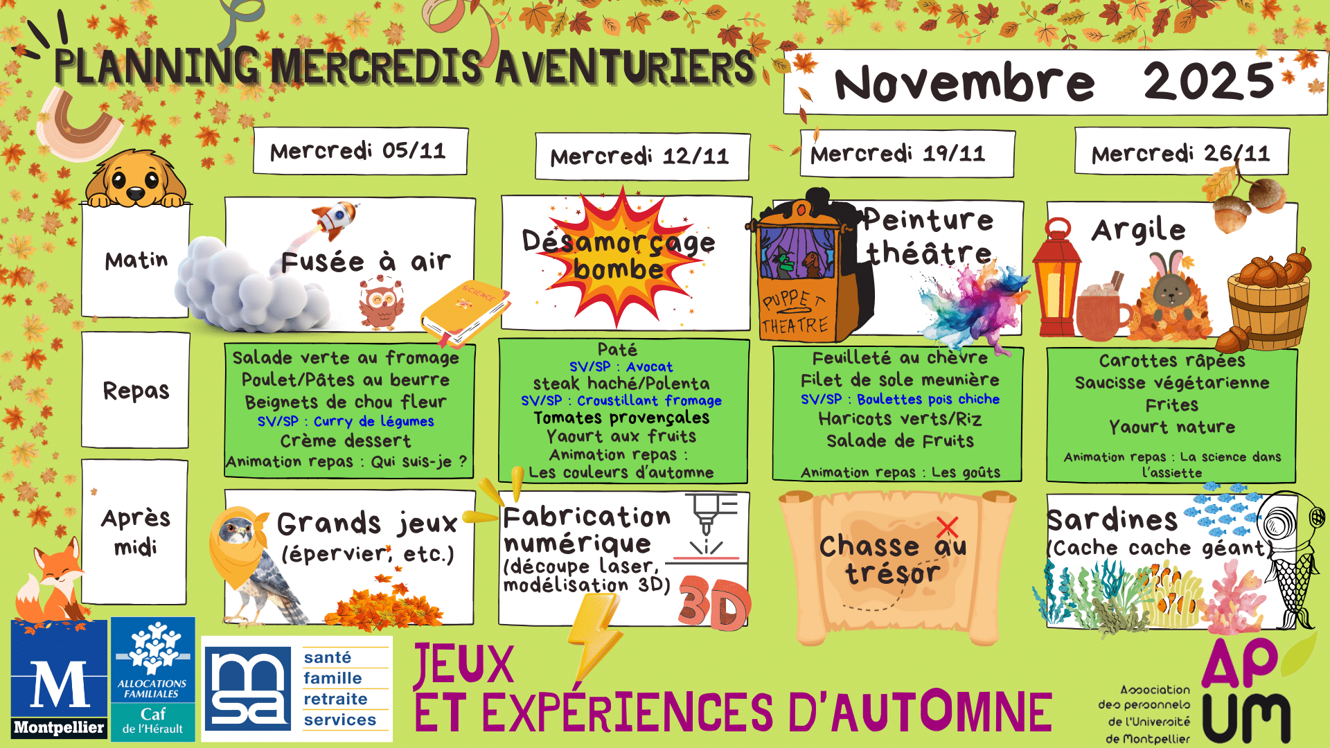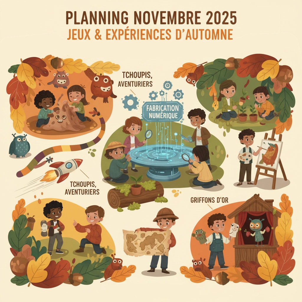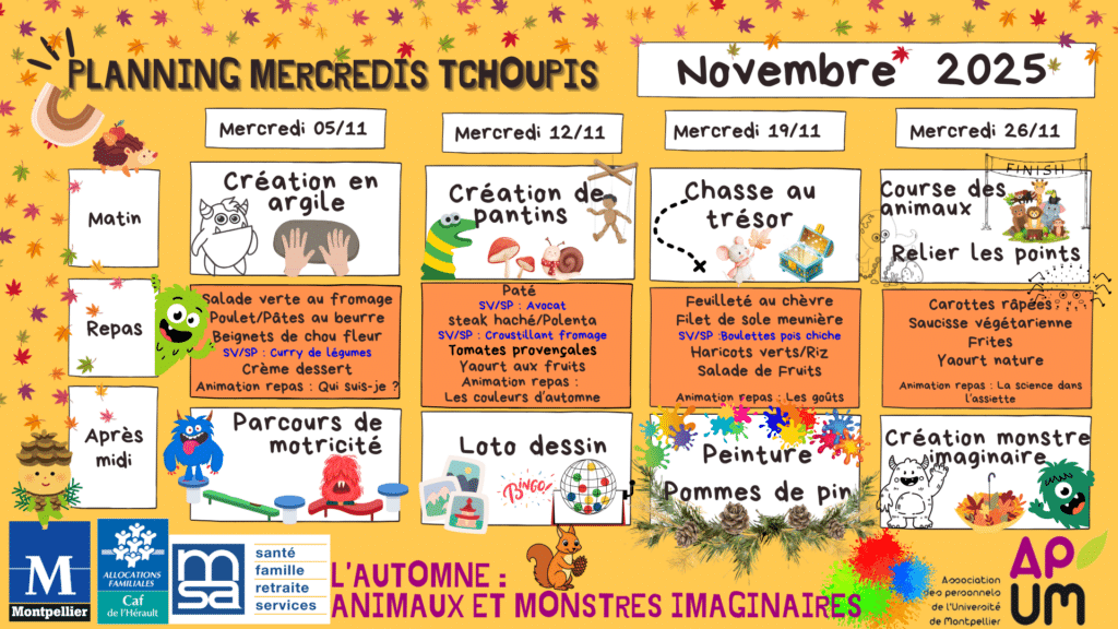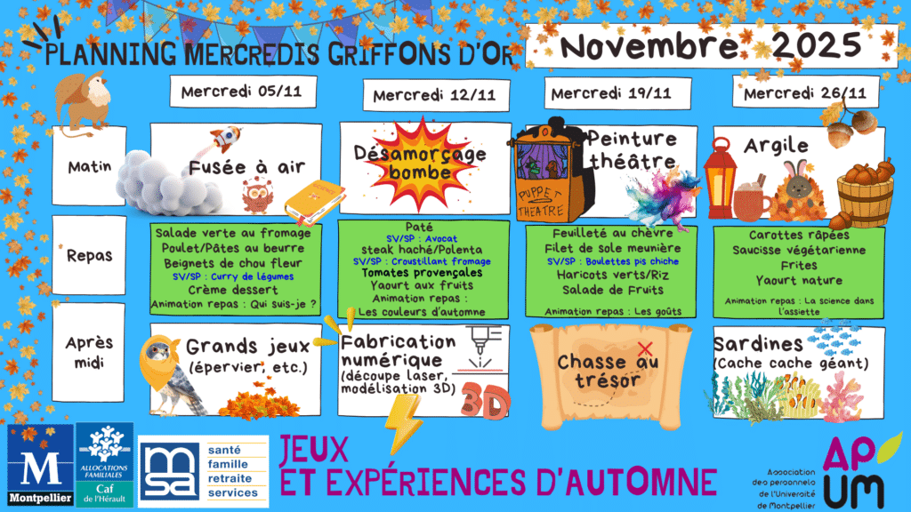 L’automne 2025 à l’APUM s’annonce riche en émotions et en découvertes ! Nos équipes ont préparé des programmes stimulants pour les mercredis et les vacances. Guidés par les couleurs de la saison et la magie d’Halloween, les Tchoupis, Aventuriers et Griffons d’Or vivront des moments uniques, placés sous le signe de la créativité, du jeu collectif et de l’exploration. Chaque planning a été soigneusement conçu pour s’adapter au rythme et à l’imaginaire de chaque groupe, favorisant l’épanouissement personnel et l’esprit d’équipe dans un cadre bienveillant.