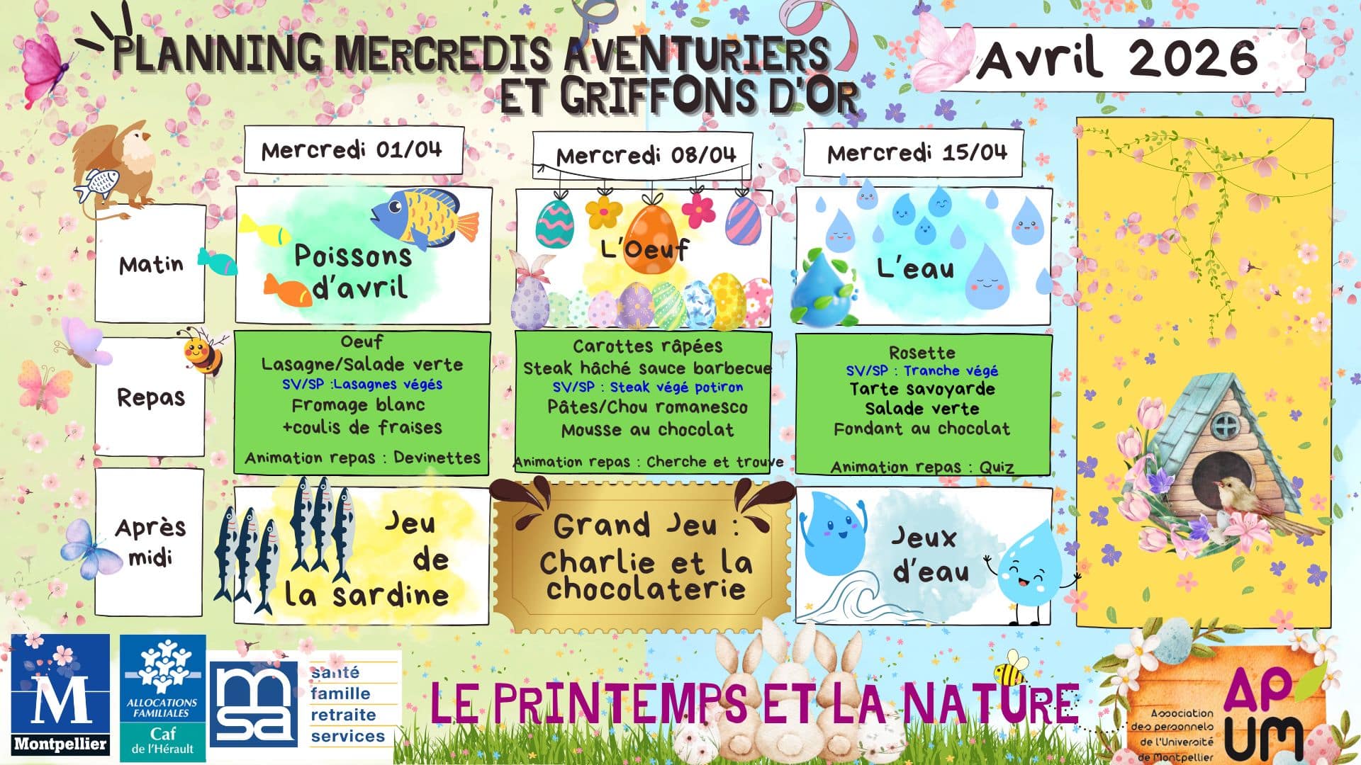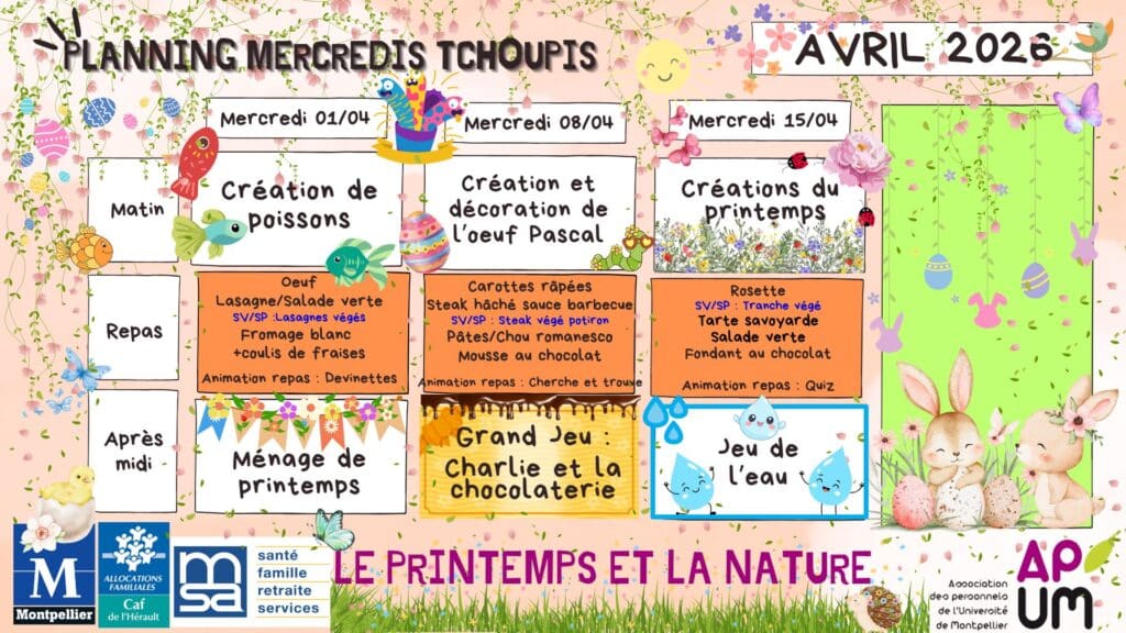 L’Association du Personnel de l’Université de Montpellier (APUM) vous informe de la mise à disposition des plannings du Centre de Loisirs pour les mercredis du mois d’avril 2026.